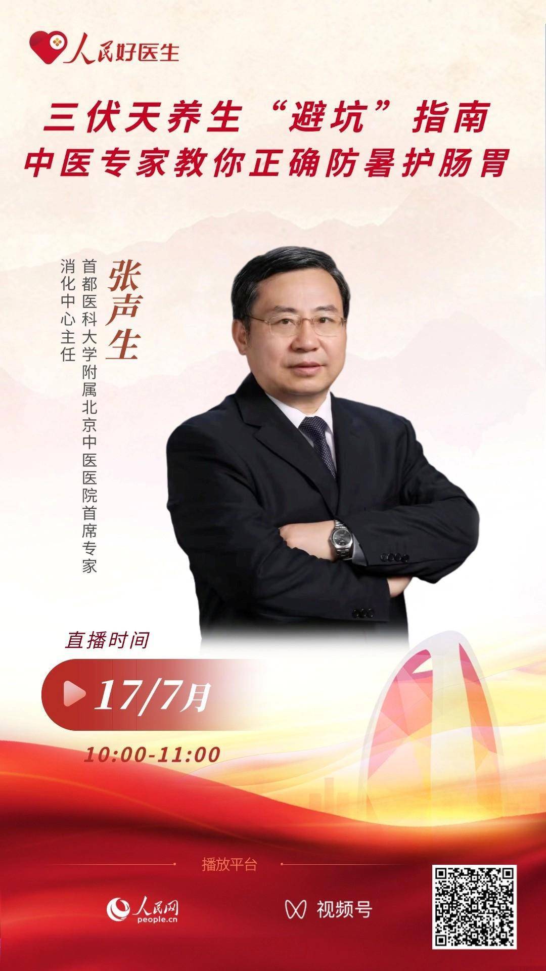 7月17日10:00-11:00,首都医科大学附属北京中医医院首席专家、消化中心主任张声生教授做客“人民好医生”客户端,为你揭秘三伏天养生的正确打开方式,教你避开养生误区,健康度夏。